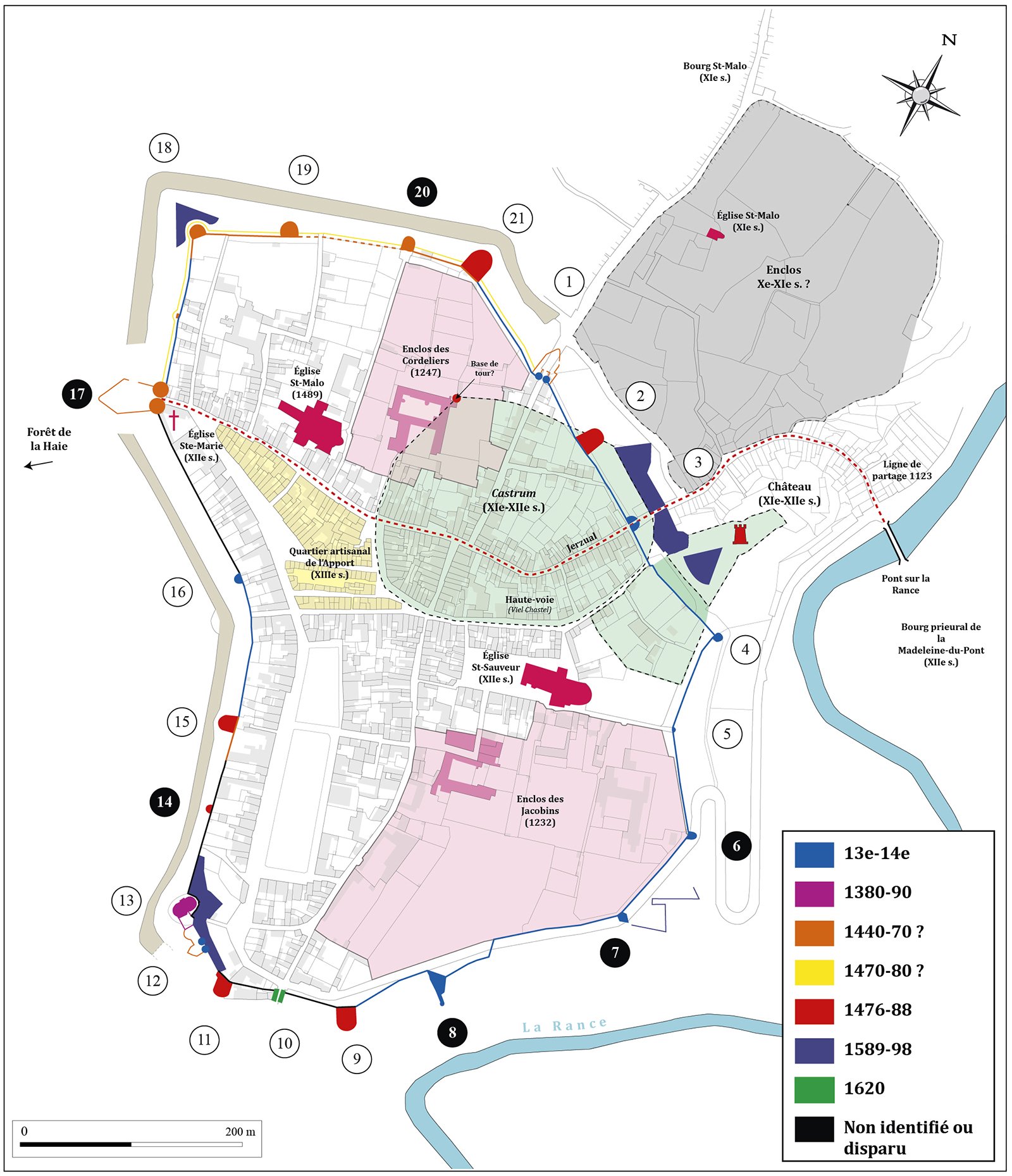 En effet, à cette période, chaque seigneur avait sa demeure, le château de Léhon pour le seigneur de Dinan Sud, et, soit le Château primitif de Dinan, soit le Palais situé à l’emplacement du couvent des Cordeliers pour le seigneur de Dinan Nord.