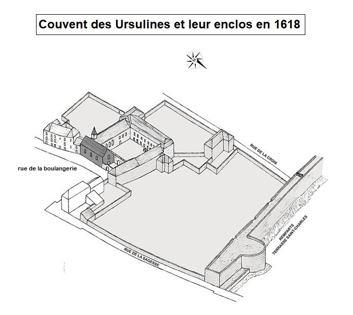 Une fois terminé, le couvent forme un quadrilatère composé de trois ailes situées au nord, à l’ouest et au sud, un mur ferme l’enclos à l’est constituant ainsi le cloître des religieuses. Au nord un vaste espace est occupé par le jardin du couvent, il s’étend jusqu’aux remparts. Deux autres jardins appartiennent au couvent, l’un à l’est longe la rue de la Croix, l’autre est situé au sud.