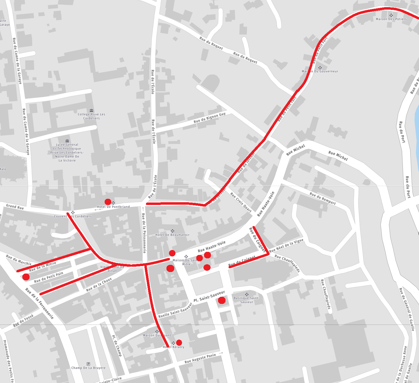 En rouge, lieux et rues dans lesquels vous pourrez voir ces hôtels et maisons classés.